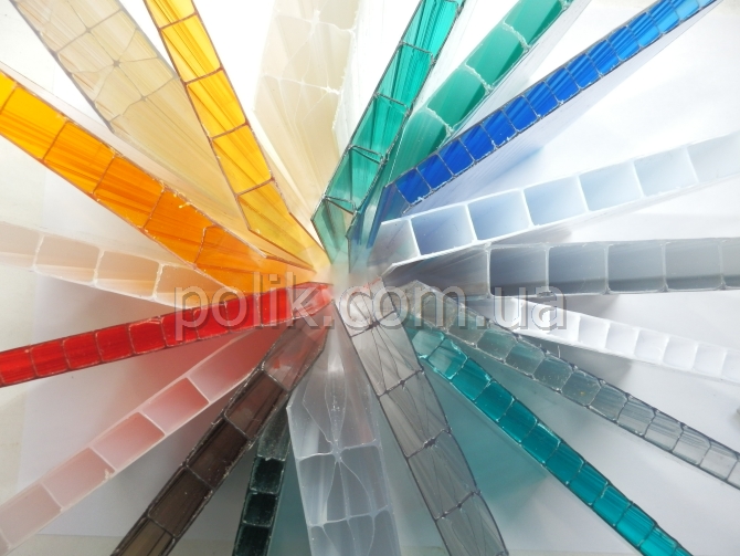 Мы предлагаем сотовый поликарбонат в Киеве, Одессе, Днепре, Броварах, Харькове, Запорожье, Кривом Роге и других городах толщиной 4, 6, 8, 10, 16 мм и более. Размеры 2,1м х 6м и 2,1м х 12м. Цена материала за лист и м2 доступны на сайте. Вам доступны такие цвета как прозрачный, молочный, бронза, зеленый, синий, желтый, бирюза, красный, янтарный и другие оттенки. Светопропускание прозрачного листа 82-85%, бронзового 40%. К вашим услугам поликарбонат Полигаль, Колибри, Киви и другие. Все листы имеют ультрафиолетовую защиту, которая защищает материал от губительного разрушения солнечной радиации.